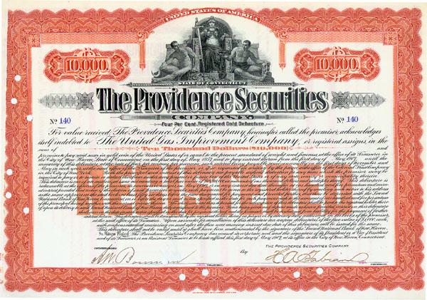 1907, Connecticut. $10,000 bond bearing 4% interest. Orange/Black. Vignette of allegorical figures at top center. Punch cancelled. Very fine.