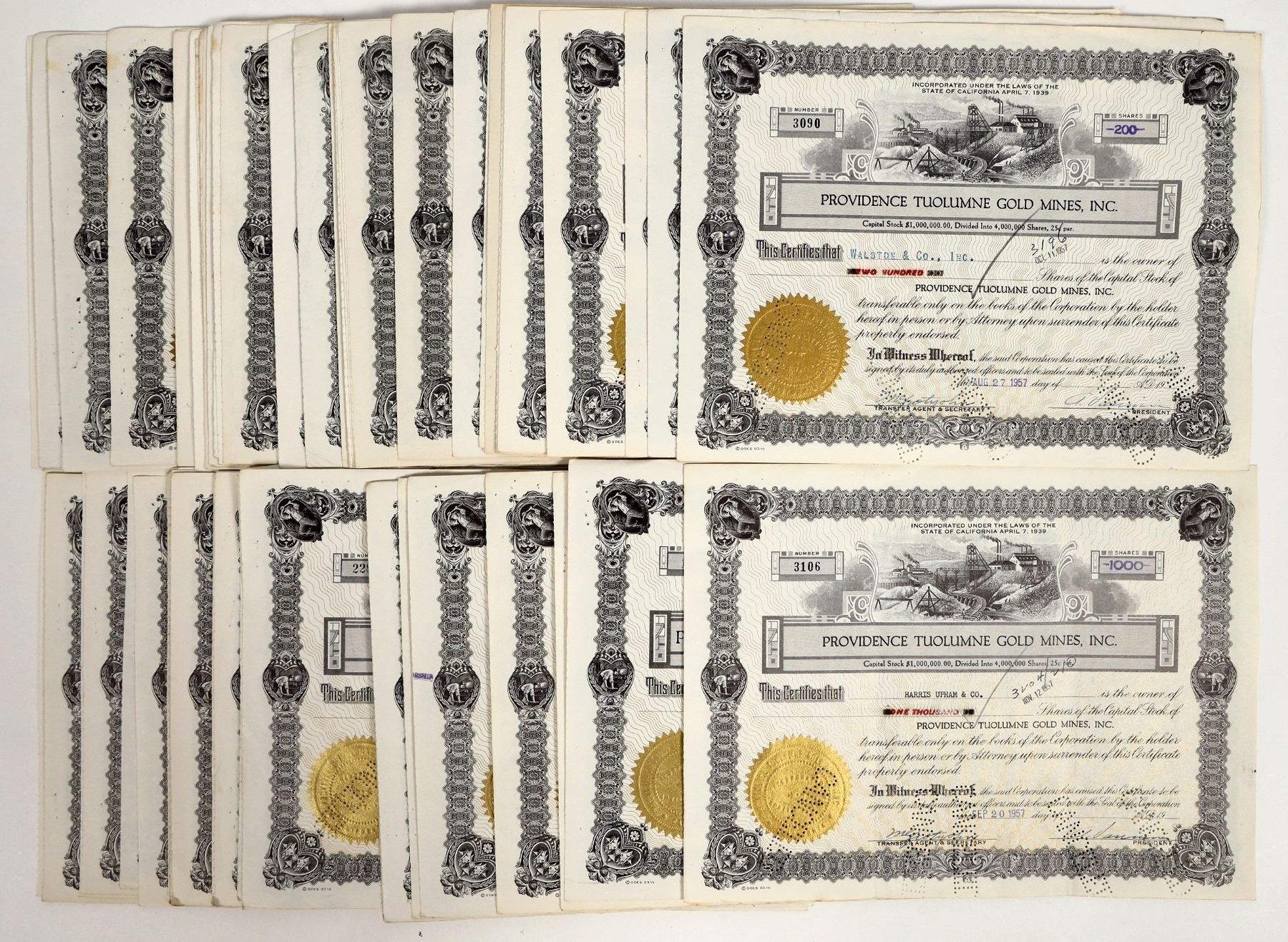 About 100 Providence Tuolumne Gold Mines, Inc. Stocks c. 1945-65. Issued, cancelled. One the Motherlode in California. Nice group.