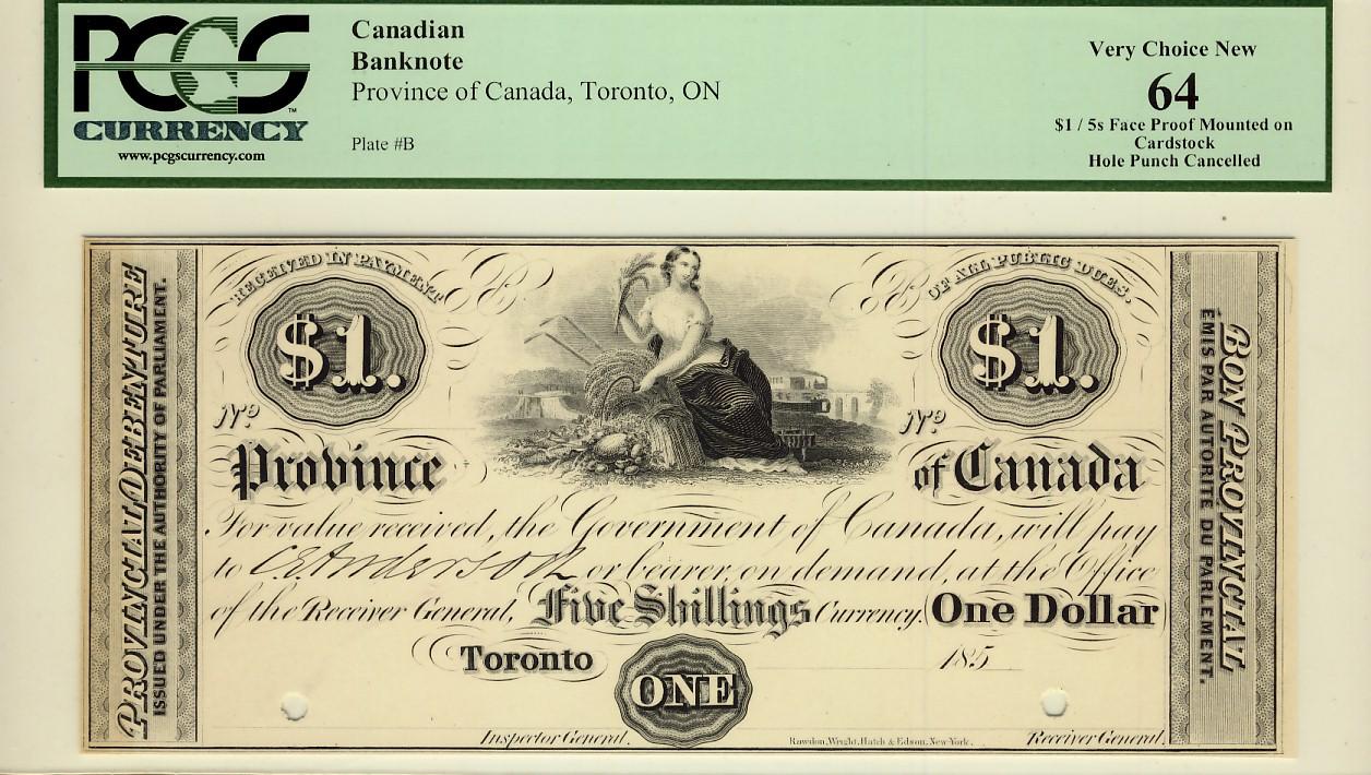 Province of Canada 185_ $1 PC-UNL Face Proof PCGS UNC64. Very scarce'
