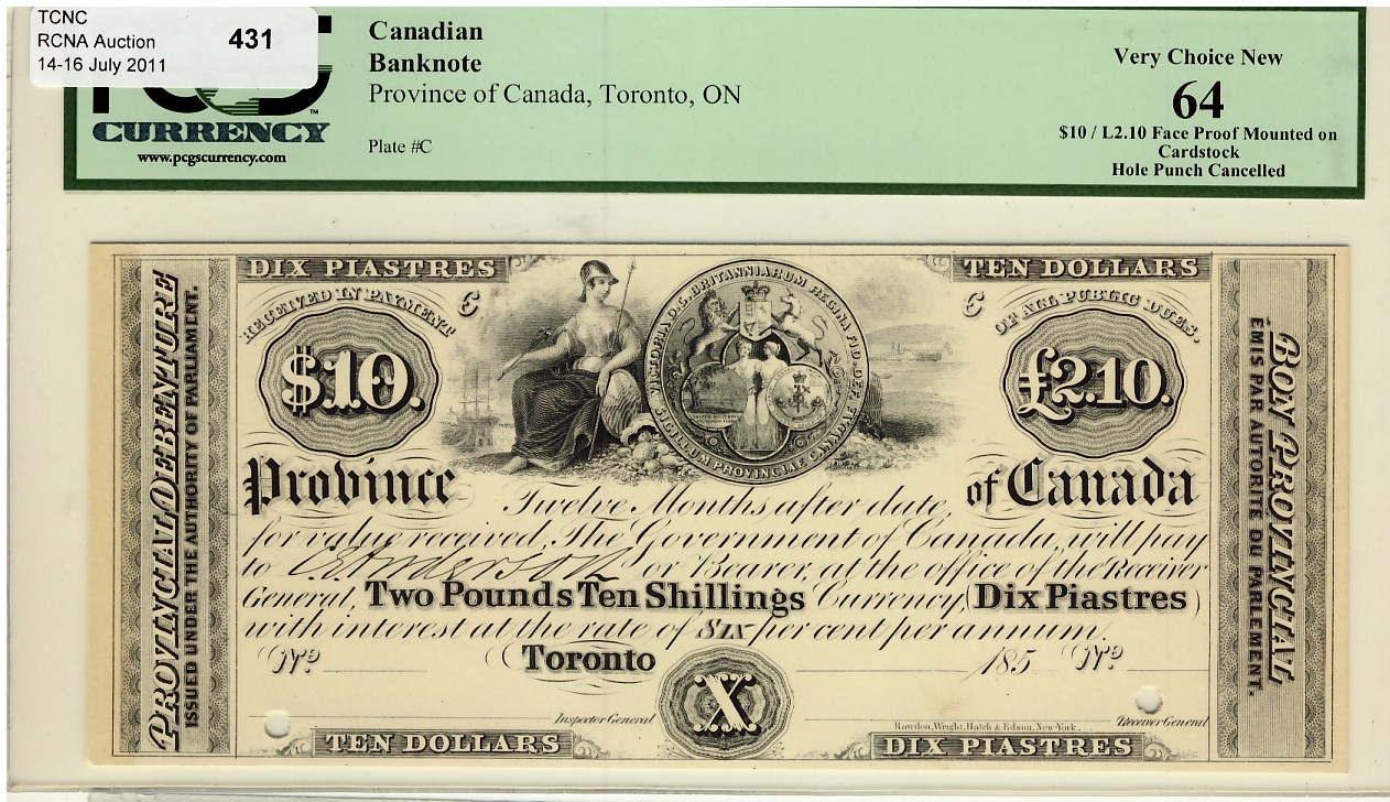 Province of Canada 185_ $10 PC-UNL Face Proof PCGS UNC64. Very scarce'