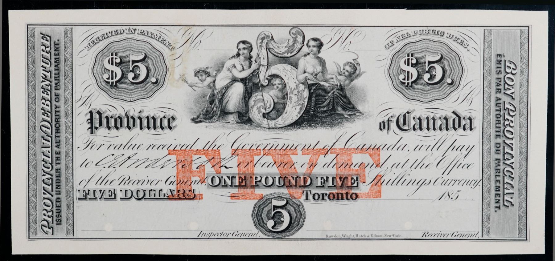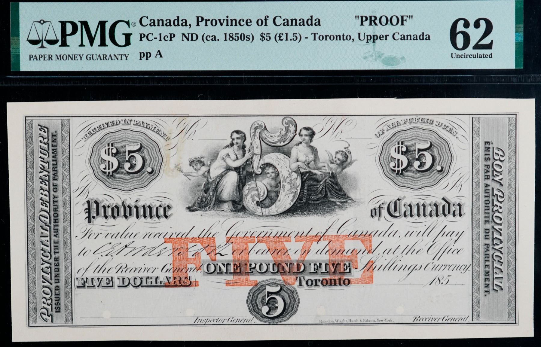 Province of Canada 1850 $5 PC-1cP PMG Choice Uncirculated-62. Rarely seen and offered.