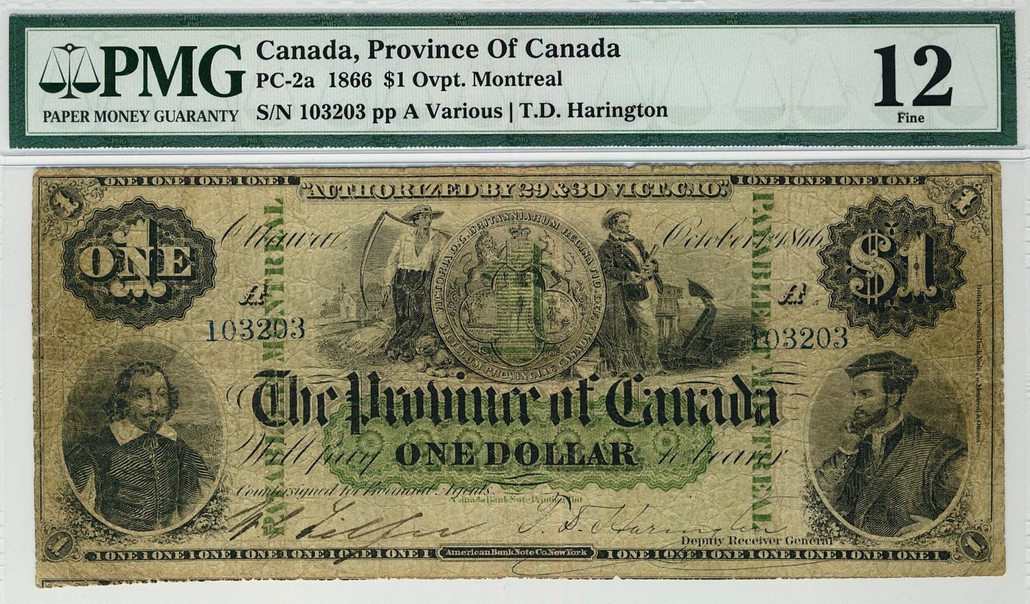 Province of Canada 1866 $1 PC-2a 103203 PMG F12. Rare this nice. Problem free. Desirable example.
