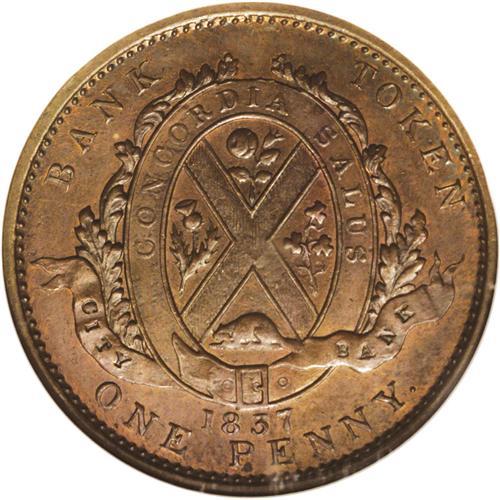 <B>1837 Province of Canada Bank of Montreal Bank Token One Penny, PC-2A1, MS63 Red and Brown NGC.</B></I> The type with the City Bank on the ribbon. A super token, exhibiting lots of remaining original mint luster. Current Uncirculated catalog value is about $625.