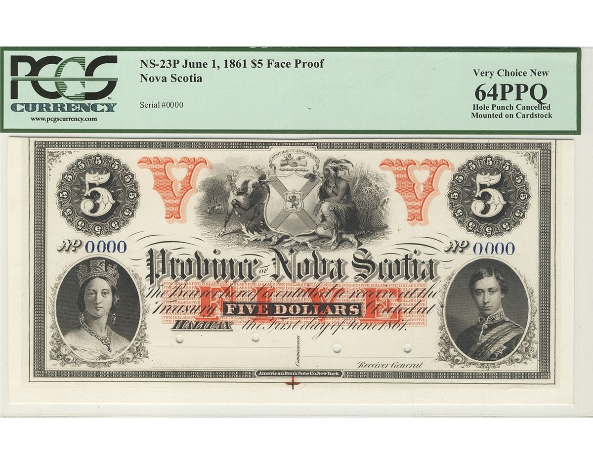 Province of Nova Scotia 1861 $5 Face Proof NS-23P PCGS CH UNC64PPQ. Colourful, rarely offered.
