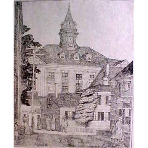 Town Hall, Provincetown by Chester Leich. Signed lower right and dated 1947 in plate. Image 6 1/2 inches high x 5 1/4 inches wide.<p>Born in Evansville, Indiana - died 1978 Alexandria Va. He traveled widely in the Southwest, doing a number of paintings and drypoint and other etchings of Southwestern subjects.<p>He studied in Florence, Munich, and Berlin and with Siebelist in Hamburg, Germany.<p>He was a member of the Chicago and Brooklyn societies of etchers.