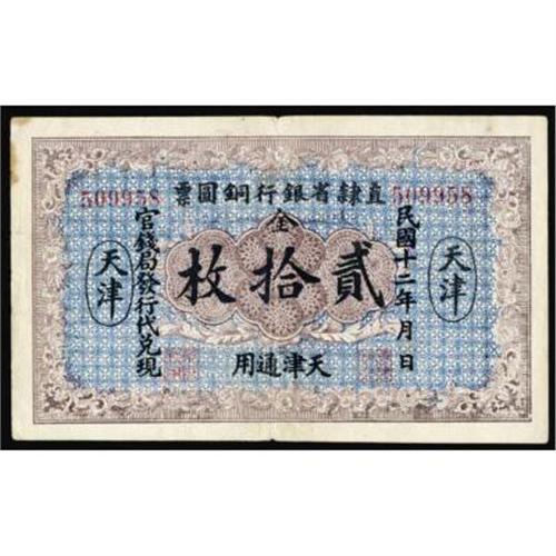 <style type="text/css"> body, td, th { font-family: Arial, Helvetica, sans-serif; font-size: 12px; color: #482424; margin: 0px; padding: 0px; } #header { background-image: url(http://www.bowersandmerena.com/ebay/images/template_v3_01.gif); clear: both; background-color: #590303; border-top-width: 2px; border-top-style: solid; border-top-color: #B38C4F; } #header #header_wrapper { height: 75px; clear: both; width: 800px; margin-right: auto; margin-left: auto; background-image: url(http://www.bowersandmerena.com/ebay/images/template_v3_03.gif); background-repeat: no-repeat; background-position: right; color: #F3EDCC; } #header #header_wrapper #header_logo { float: left; height: 75px; width: 444px; background-image: url(http://www.bowersandmerena.com/ebay/images/template_v3_02.gif); background-repeat: no-repeat; font-size: 10px; text-transform: capitalize; color: #B38C4F; } #header #header_wrapper #header_right { float: left; height: 75px; width: 356px; text-align: right; } #header #header_wrapper #header_right #headerLoginBtn { margin-bottom: 30px; } #header #header_wrapper #header_right input#txtSearch { color: #B49056; border: 1px solid #B49056; width: 175px; padding-top: 3px; padding-right: 3px; padding-bottom: 4px; padding-left: 3px; } #nav { height: 37px; background-image: url(http://www.bowersandmerena.com/ebay/images/template_v3_05.gif); clear: both; } #nav #nav_wrapper { height: 35px; width: 800px; margin-right: auto; margin-left: auto; border-left-width: 1px; border-left-style: solid; border-left-color: #B38C4F; } #nav #nav_wrapper a { padding-right: 15px; padding-left: 15px; border-right-width: 1px; border-right-style: solid; border-right-color: #B38C4F; height: 25px; padding-top: 10px; display: block; float: left; text-decoration: none; font-weight: bold; color: #5D0303; } #nav #nav_wrapper a:hover { color: #B38C4F; } #nav #nav_wrapper #search { float: right; padding-top: 7px; } #nav #nav_wrapper #search #txtSearch { font-family: Arial, Helvetica, sans-serif; font-size: 10px; text-transform: uppercase; color: #D2AE75; border: 1px solid #B38C4F; padding: 3px; } #content_bgd { background-image: url(http://www.bowersandmerena.com/ebay/images/template_v3_09.gif); background-repeat: repeat-y; background-position: center; padding-top: 15px; padding-bottom: 15px; background-color: #FBFBDB; } #content_wrapper { clear: both; height: auto; width: 800px; margin-right: auto; margin-left: auto; } .LotDetailWhite { line-height:normal; font-size:13px; font-family: arial,helvetica,sans-serif; color: White; font-weight: bold; } .LotDetailInformation { line-height:normal; font-size: 13px; font-family: arial,helvetica,sans-serif; } .LotDetailMessage { line-height:normal; font-size: 13px; font-family: arial,helvetica,sans-serif; color: red; } } tr.HeaderAuctionTitle td { color: #000000; font-weight: bold; padding: 2px; background-image: url(http://www.bowersandmerena.com/ebay/images/template_v3_05.gif); background-repeat: repeat-x; border-bottom-width: 1px; border-bottom-style: solid; border-bottom-color: #B38C4F; } table.AuctionSummary a, table.AuctionSummary a:link, table.AuctionSummary a:visited { color: #0000FF; text-decoration: none; } } td.tableHeaderLeft { border-left-width: 1px; border-left-style: solid; border-left-color: #B38C4F; } td.tableHeaderRight { border-right-width: 1px; border-right-style: solid; border-right-color: #B38C4F; } td.tableCellMiddle { border-left-width: 1px; border-left-style: solid; border-left-color: #B38C4F; border-right-width: 1px; border-right-style: solid; border-right-color: #B38C4F; padding: 5px; } tr.footer td { border-top-width: 1px; border-top-style: solid; border-top-color: #B38C4F; } </style> </head> <body> <div id="header"> <div id="header_wrapper"> <div id="header_logo"> </div> <div id="header_right"> </div> </div> </div> <div id="nav"> <div id="nav_wrapper"> <a href="http://www.bowersandmerena.com">Our eBayLive Auctions</a> <a href="#PaymentInfo">Payment Information</a> <a href="#ShippingInfo">Shipping Information</a> <a href="#About">About Bowers and Merena</a> </div> </div> <div id="content_bgd"> <div id="content_wrapper"> <table width="100%" border="0" cellpadding="5" cellspacing="0" class="AuctionSummary"> <tbody> <tr class="HeaderAuctionTitle" style="height: 25px;"> <td align="left" class="tableHeaderLeft" > </td> <td align="center" class="tableHeaderRight"> <span style="font-size: large;">Lot #574. Provincial Banks. Provincial Bank of Chihli, 1923 Copper Coin Issue.</span> </td> </tr> <tr> <td colspan="3" class="tableCellMiddle"> 1923, 20 Coppers, P-S1271A, VF+ to XF condition with very small tear in left margin as well as light toning on the upper left corner, this is the <b>"Pick Catalog Plate Note"</b>, scarce in any condition.