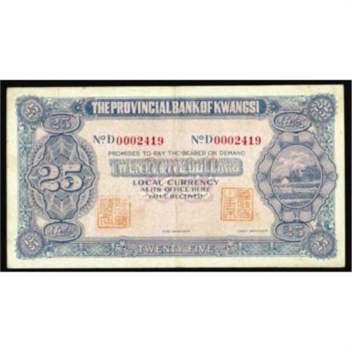 <style type="text/css"> body, td, th { font-family: Arial, Helvetica, sans-serif; font-size: 12px; color: #482424; margin: 0px; padding: 0px; } #header { background-image: url(http://www.bowersandmerena.com/ebay/images/template_v3_01.gif); clear: both; background-color: #590303; border-top-width: 2px; border-top-style: solid; border-top-color: #B38C4F; } #header #header_wrapper { height: 75px; clear: both; width: 800px; margin-right: auto; margin-left: auto; background-image: url(http://www.bowersandmerena.com/ebay/images/template_v3_03.gif); background-repeat: no-repeat; background-position: right; color: #F3EDCC; } #header #header_wrapper #header_logo { float: left; height: 75px; width: 444px; background-image: url(http://www.bowersandmerena.com/ebay/images/template_v3_02.gif); background-repeat: no-repeat; font-size: 10px; text-transform: capitalize; color: #B38C4F; } #header #header_wrapper #header_right { float: left; height: 75px; width: 356px; text-align: right; } #header #header_wrapper #header_right #headerLoginBtn { margin-bottom: 30px; } #header #header_wrapper #header_right input#txtSearch { color: #B49056; border: 1px solid #B49056; width: 175px; padding-top: 3px; padding-right: 3px; padding-bottom: 4px; padding-left: 3px; } #nav { height: 37px; background-image: url(http://www.bowersandmerena.com/ebay/images/template_v3_05.gif); clear: both; } #nav #nav_wrapper { height: 35px; width: 800px; margin-right: auto; margin-left: auto; border-left-width: 1px; border-left-style: solid; border-left-color: #B38C4F; } #nav #nav_wrapper a { padding-right: 15px; padding-left: 15px; border-right-width: 1px; border-right-style: solid; border-right-color: #B38C4F; height: 25px; padding-top: 10px; display: block; float: left; text-decoration: none; font-weight: bold; color: #5D0303; } #nav #nav_wrapper a:hover { color: #B38C4F; } #nav #nav_wrapper #search { float: right; padding-top: 7px; } #nav #nav_wrapper #search #txtSearch { font-family: Arial, Helvetica, sans-serif; font-size: 10px; text-transform: uppercase; color: #D2AE75; border: 1px solid #B38C4F; padding: 3px; } #content_bgd { background-image: url(http://www.bowersandmerena.com/ebay/images/template_v3_09.gif); background-repeat: repeat-y; background-position: center; padding-top: 15px; padding-bottom: 15px; background-color: #FBFBDB; } #content_wrapper { clear: both; height: auto; width: 800px; margin-right: auto; margin-left: auto; } .LotDetailWhite { line-height:normal; font-size:13px; font-family: arial,helvetica,sans-serif; color: White; font-weight: bold; } .LotDetailInformation { line-height:normal; font-size: 13px; font-family: arial,helvetica,sans-serif; } .LotDetailMessage { line-height:normal; font-size: 13px; font-family: arial,helvetica,sans-serif; color: red; } } tr.HeaderAuctionTitle td { color: #000000; font-weight: bold; padding: 2px; background-image: url(http://www.bowersandmerena.com/ebay/images/template_v3_05.gif); background-repeat: repeat-x; border-bottom-width: 1px; border-bottom-style: solid; border-bottom-color: #B38C4F; } table.AuctionSummary a, table.AuctionSummary a:link, table.AuctionSummary a:visited { color: #0000FF; text-decoration: none; } } td.tableHeaderLeft { border-left-width: 1px; border-left-style: solid; border-left-color: #B38C4F; } td.tableHeaderRight { border-right-width: 1px; border-right-style: solid; border-right-color: #B38C4F; } td.tableCellMiddle { border-left-width: 1px; border-left-style: solid; border-left-color: #B38C4F; border-right-width: 1px; border-right-style: solid; border-right-color: #B38C4F; padding: 5px; } tr.footer td { border-top-width: 1px; border-top-style: solid; border-top-color: #B38C4F; } </style> </head> <body> <div id="header"> <div id="header_wrapper"> <div id="header_logo"> </div> <div id="header_right"> </div> </div> </div> <div id="nav"> <div id="nav_wrapper"> <a href="http://www.bowersandmerena.com">Our eBayLive Auctions</a> <a href="#PaymentInfo">Payment Information</a> <a href="#ShippingInfo">Shipping Information</a> <a href="#About">About Bowers and Merena</a> </div> </div> <div id="content_bgd"> <div id="content_wrapper"> <table width="100%" border="0" cellpadding="5" cellspacing="0" class="AuctionSummary"> <tbody> <tr class="HeaderAuctionTitle" style="height: 25px;"> <td align="left" class="tableHeaderLeft" > </td> <td align="center" class="tableHeaderRight"> <span style="font-size: large;">Lot #670. Provincial Banks. Provincial Bank of Kwangsi.</span> </td> </tr> <tr> <td colspan="3" class="tableCellMiddle"> 1928, $25, P-S2337a., XF to XF+, scarce note in this condition