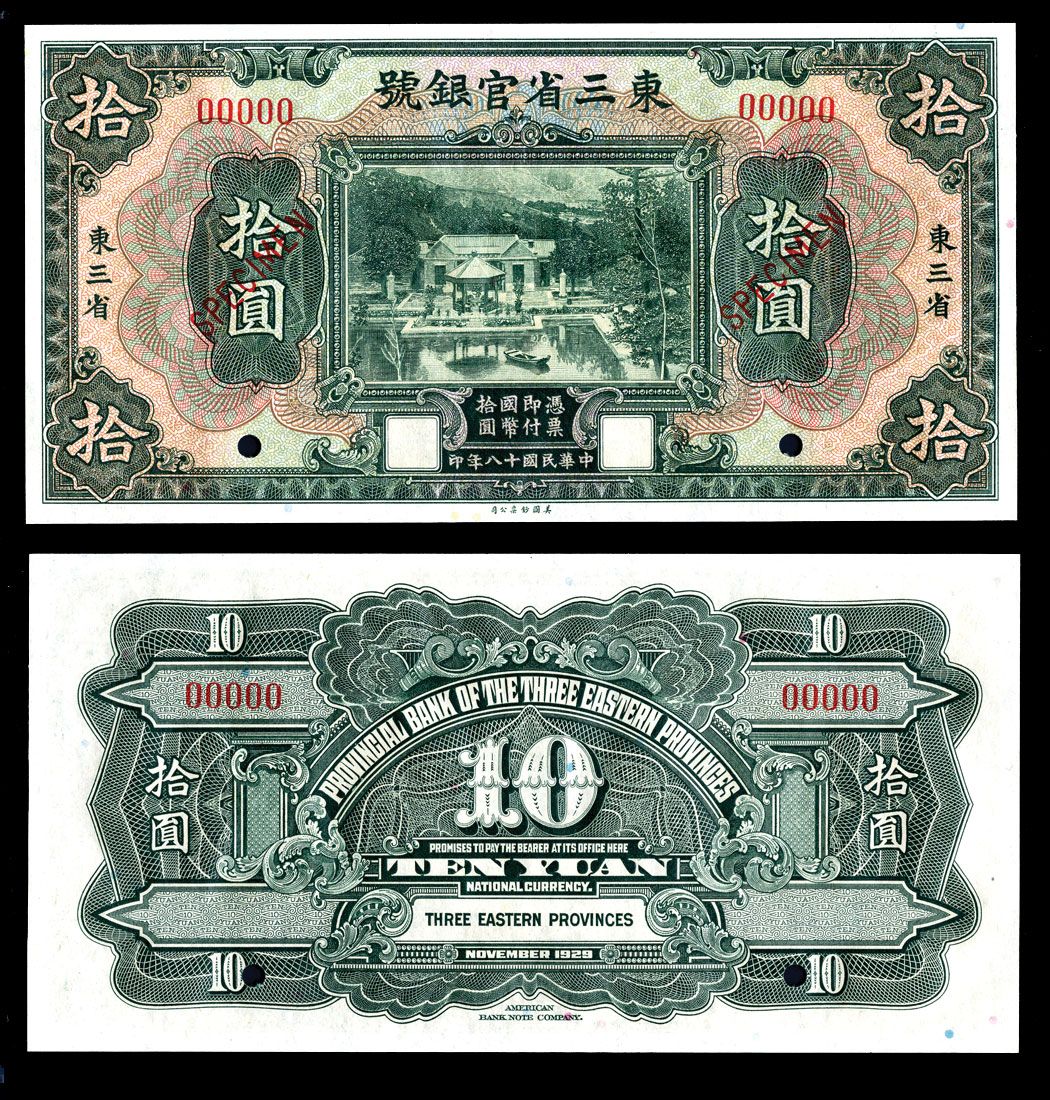 China, 1929, 10 Yuan, P-S2964s1, (S/M #T214-192a). Specimen banknote, Green and m/c face with pavilion by pool in center and green back. Red specimen overprint, Ò00000Ó serial numbers and POC's. PMG graded Gem Uncirculated 66 EPQ (Exceptional Paper Quality)Ó, ABNC.