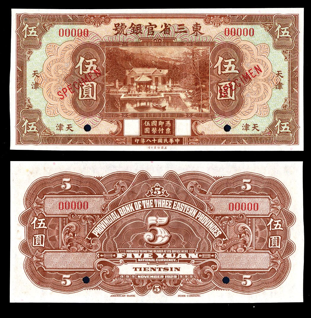 Tientsin, Three Eastern Provinces, China. November 1929. 5 Yuan, P-S2963s2, (S/M #T214-190-). Specimen banknote, brown and m/c face with pavilion in center and brown back. Red specimen overprint, Ò00000Ó serial numbers and POC's. PMG graded Gem Uncirculated 65 EPQ with large even margins, bright colors and sharp corners. Rare note in any grade. ABNC.
