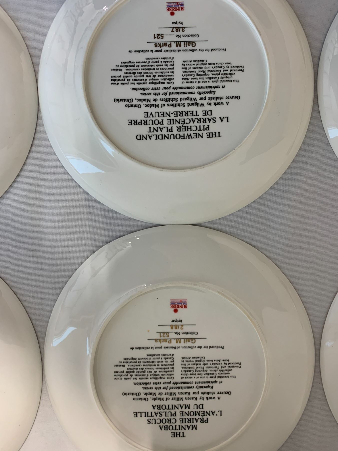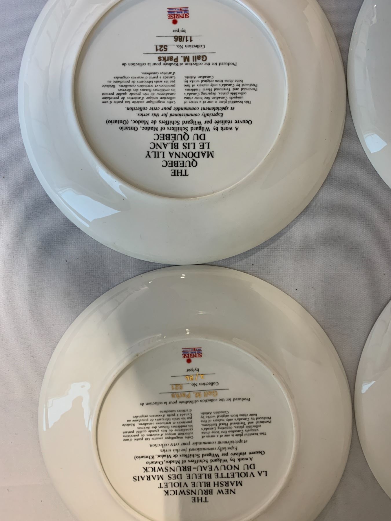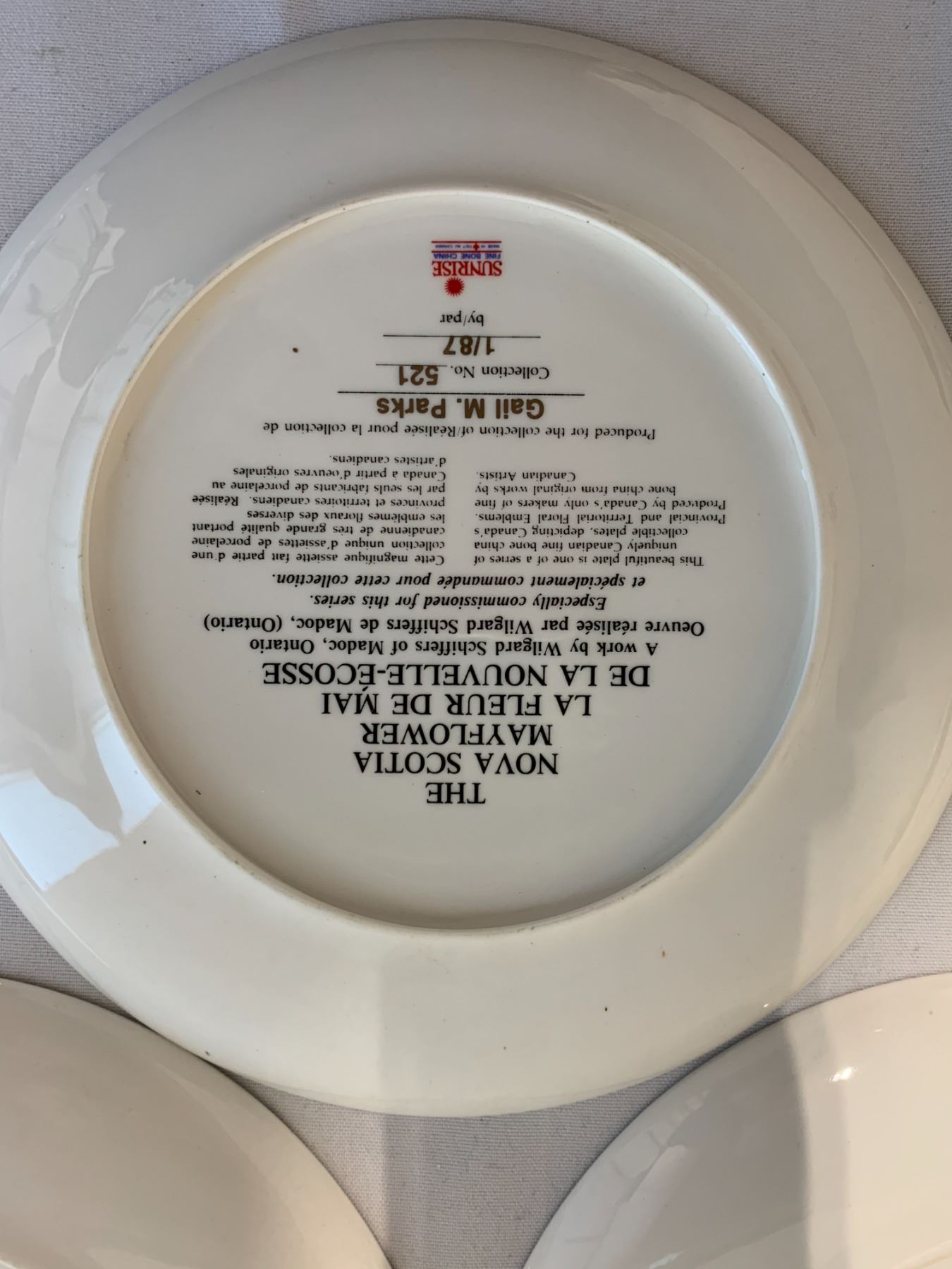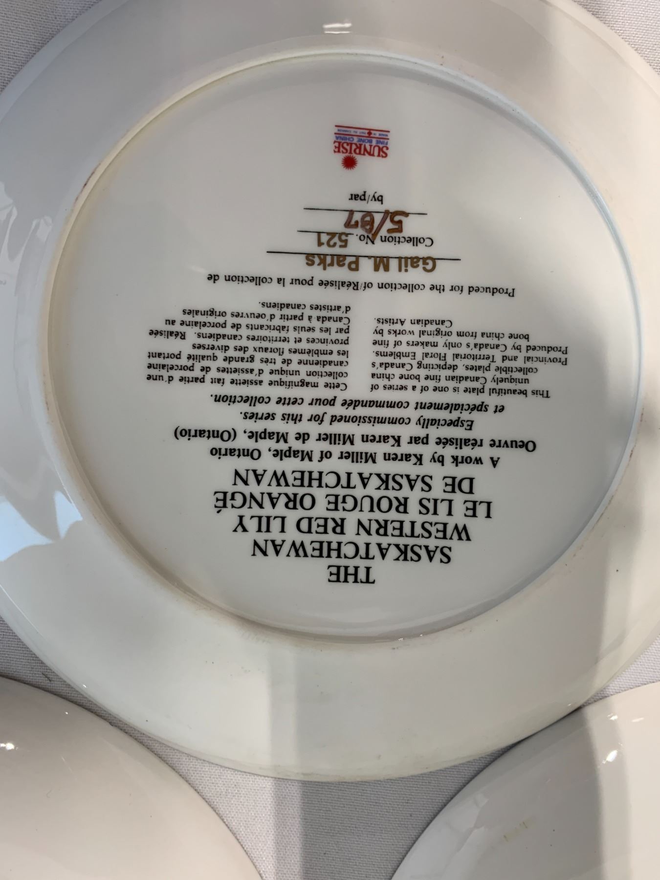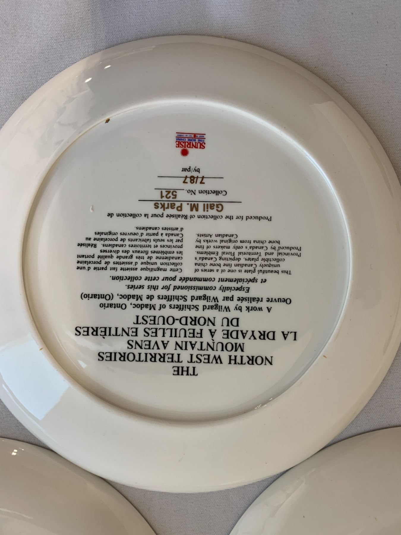 11 Plates by, Gail M. Parks, Sunrise Fine Bone China, Ontario has a chip