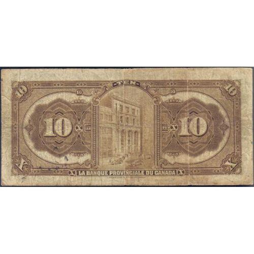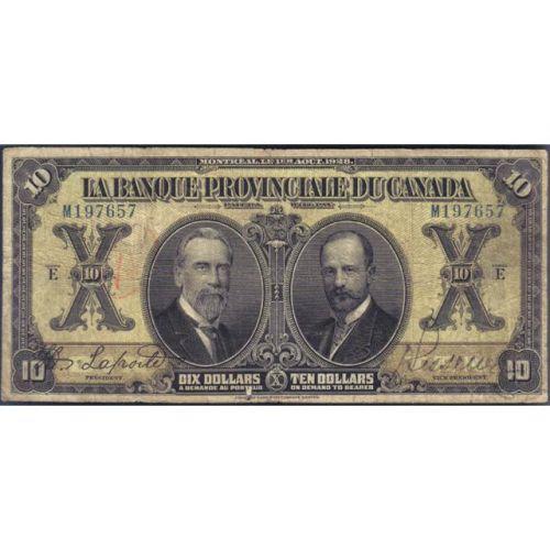 La Banque Provinciale du Canada Ten Dollars 1928, CH 615-14-16, Serial Number M197657, PMG Very Good 10. Very slight raggedness at the top margin