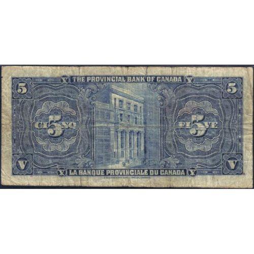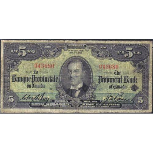 La Banque Provinciale du Canada Five Dollars 1936, Blue Back, CH 615-18-02, Serial Number 043680, PMG Very Good 10