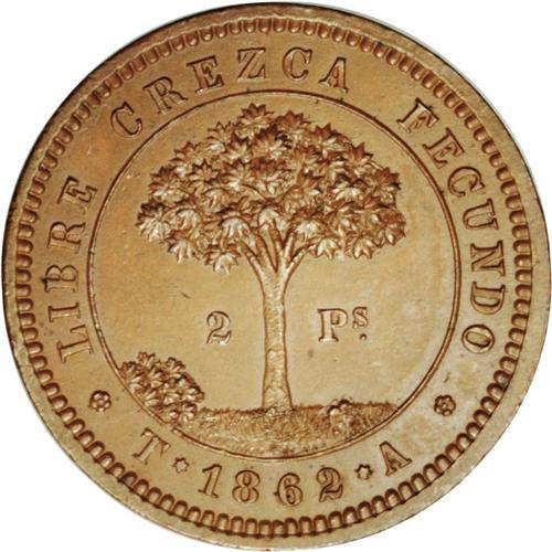 Provisional Coinage. Bronze Pattern 2 Pesos 1862T-A, KM Provisional Coinage. Bronze Pattern 2 Pesos