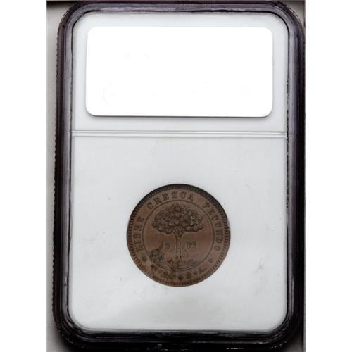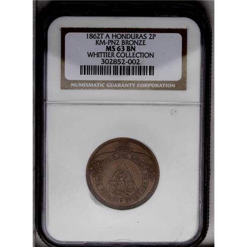 <B>Provisional Coinage. Bronze Pattern 2 Pesos 1862T-A, </B></I>KM-Pn2, MS63 NGC Brown, a choice example with full sheen and needle sharp details. Scarce and popular series.
