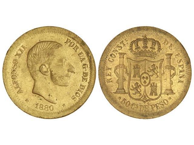 Prueba 50 Centavos de Peso. 1880. MANILA. Latón. Acuñada probablemente a finales de los años 40 para ensayo de máquinas. (Pequeños golpecitos). He-108a; KM-Pn17. PRUEBA.