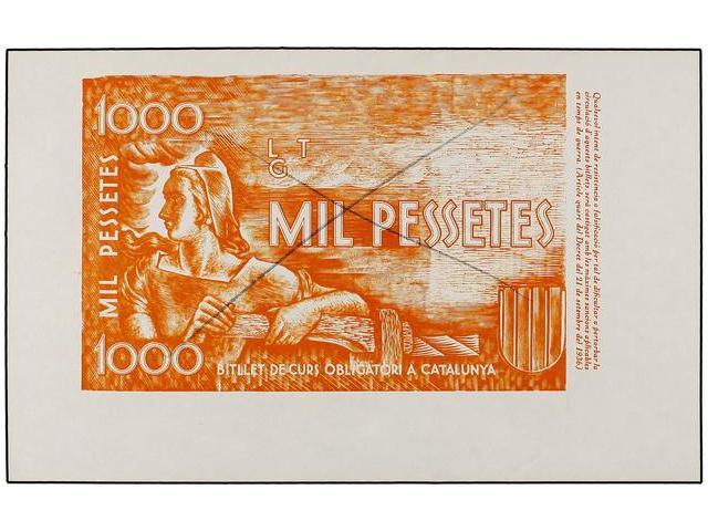 Prueba de anverso 1.000 Pessetes. (10 Agost 1950). GENERALITAT DE CATALUNYA. Billete no emitido en color naranja, sin parte del texto. Tachado en lápiz. AT-PGC-3a; Ed-cita pág. 89; LB-cita pág. 756 var. color. SC.