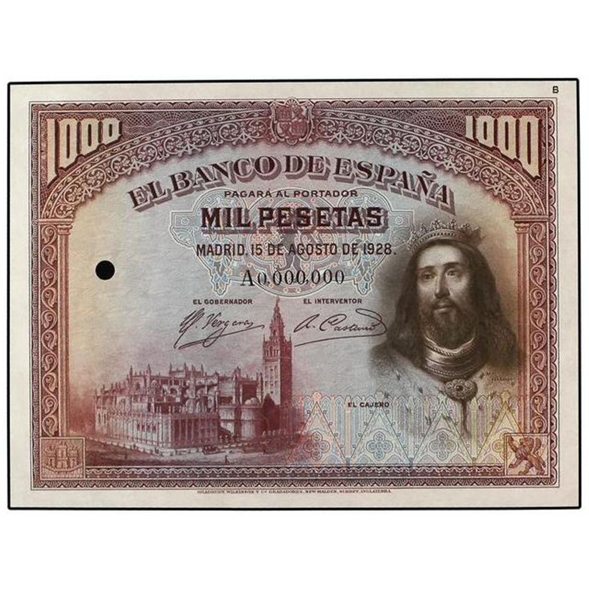 Prueba de color 1.000 Pesetas. 15 Agosto 1928. Anv.: Violeta. Rev.: Verde. San Fernando. Nº A0.000.000.Taladro. RARO. Ed-No cat.; LB-140ma, mismo ejemplar. SC.