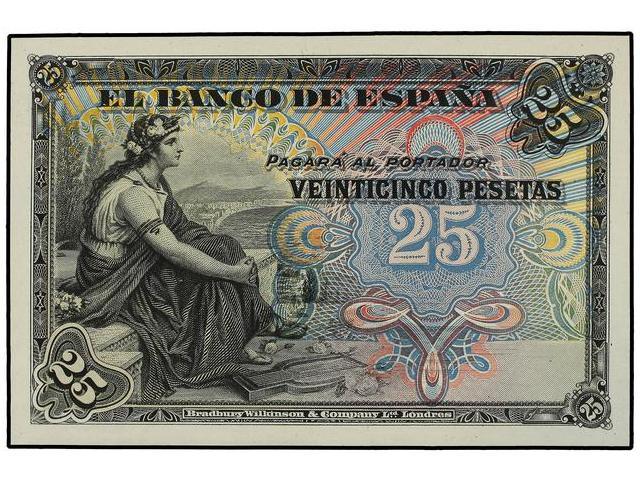 Prueba de color de anverso 25 Pesetas. (24 Septiembre 1906). Color amarillo. Ed-No cat.; LB-98p, mismo ejemplar. SC.
