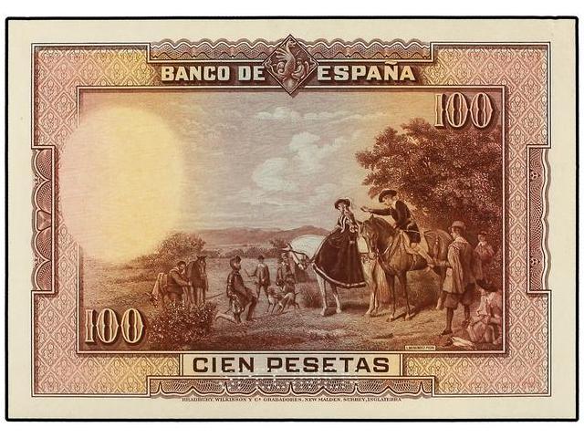 Prueba de color de reverso de 100 Pesetas. 15 Agosto 1928. Cervantes. Color rosa. SPECIMEN en taladro. (Arrugas en esquina). Ed-No cat.; LB-139pa, mismo ejemplar. SC.