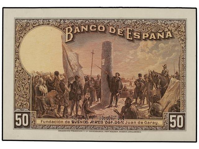 Prueba de color en reverso 50 Pesetas. (17 Mayo 1927). Alfonso XIII. Color marrón. SPECIMEN en taladro. RARO. Ed-No cat.; LB-110pa, mismo ejemplar. SC.