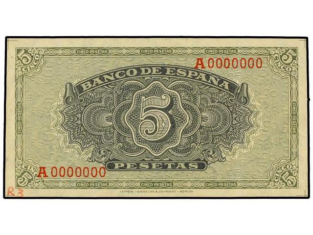 Prueba de reverso 5 Pesetas. (4 Septiembre 1940). Alcázar de Segovia. Numeración A0.000.000. RARO. Ed-D44pb; LB-253pb, mismo ejemplar. SC.