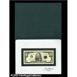 <B>Prusmack Money Art Collection.</B></I> Tim Prusmack painted his "Money Art" from 1997 until his untimely death in 2004. This collection consists of 17 different pieces of money art in folders, one piece of money art without a folder, and two promotional flyers of the same design for the 1998 FUN convention. Included in this lot is a piece of money art for the 1995 ANA convention done by the other paper money artist of our time, J.S.G. Boggs.<BR> 21 items Lot:15559