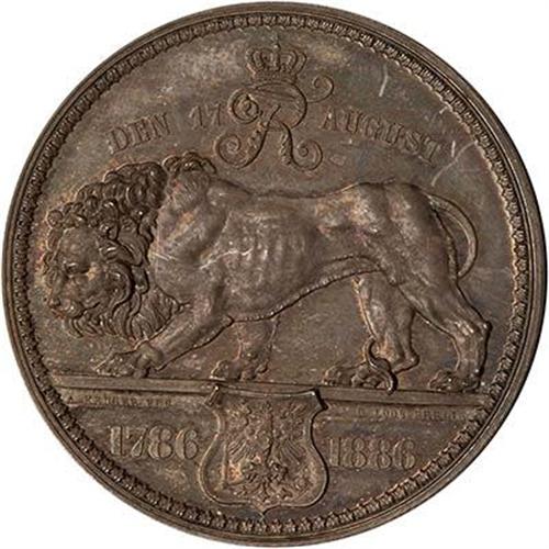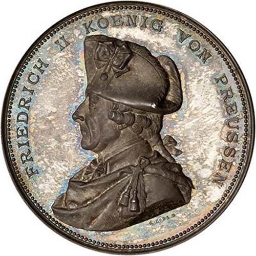 A large silver medal struck to commemorate the 100th annivesary of the death of Friedrich II, (the Great). The medal weighs 43 gm. and has a diameter of 47 mm. Portrait of Friedrich in military garb facing left, reverse, stalking lion with coat of arms an