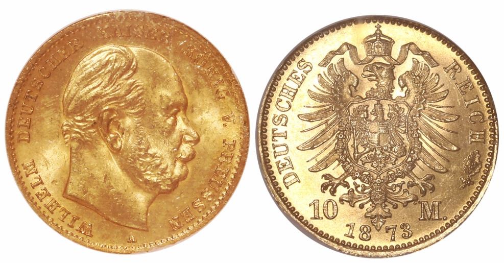 Prussia (German States), 10 mark, Wilhelm, 1873-A, encapsulated NGC MS 65 with WINGS gold sticker.
