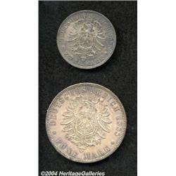 <B>Prussia. Lot of Two Coins,</B></I> KM510 and KM512 Friedrich 2 and 5 Mark 1888. XF-AU. 2 coins <BR><BR><B>Important notice:</B> Heritage usually auctions material at the rate of 200-250 lots per hour. On some occasions eBay Live bid software or the Internet may not be able to keep up with the pace of the auction. We recommend placing a realistic absentee bid now as insurance to avoid disappointment. Occasionally the auctioneer may eliminate or reject an eBay Live bid, and the auctioneer may also reopen a lot after the close of the eBay live bidding (usually because we missed an audience bid), and may reject your bid even if it shows you as the winning bidder. By bidding via eBay Live, you agree that Heritage may award the lot to another bidder at its sole discretion under the circumstances described above or any other reasonable circumstances. Since eBay bids are not shown to us until we open the lot on the floor, we treat those bids just like floor bids. In most cases the floor responds before the eBay bid is presented to us, due to Internet lag time, so for consistency we have made it a policy that floor bids are always considered first over tie eBay live bids. Also please note that all Heritage lots purchased through eBay Live carry a 20% Buyer's Premium. Please make sure you read the Terms and Conditions before you bid.