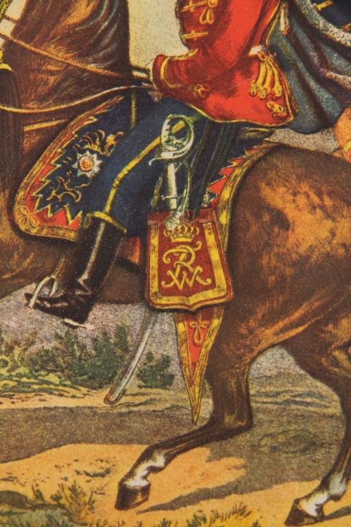 For your consideration is this Prussian Regiment of Hussar Guards, framed lithograph, originally from 1875, with a note from Colonel Schonfeldt on the back and a seal from 1967. The note on back reads, “In grateful remembrance for you cooperation with headquarters Baumholder training area; Baumholder 28, May, 1967.” The overall condition of this framed lithograph is good, with no obvious signs of damage to the frame or the lithograph. The measurements of this framed Prussian regiment of Hussar Guards lithograph are 17 3/4" x 14"; the visible art measures 11 1/4" x 8 1/2".