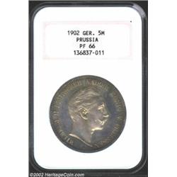 Prussia. Wilhelm 5 Mark 1902A, KM523, PR66 NGC. a majestically toned specimen that displays orange and blue peripheral iridescence on the obverse while all-encompassing shades of rose-gold and turquoise provide irresistible originality to the reverse. Important notice: We expect to be auctioning lots at the rate of 200-250 per hour. Sometimes eBay Premier live bid software cannot keep up with that pace, so we strongly recommend that you place a realistic proxy bid now as insurance to avoid disappointment. Also please note that all Heritage/CAA lots purchased through eBay Premier carry a 20% Buyer's Premium. Please make sure you read the Terms and Conditions.