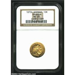 Prussia. Wilhelm Gold 10 Marks 1872A, KM502, MS65 NGC. Important notice: We expect to be auctioning lots at the rate of 200-250 per hour. Sometimes eBay Premier live bid software cannot keep up with that pace, so we strongly recommend that you place a realistic proxy bid now as insurance to avoid disappointment. Also please note that all Heritage/CAA lots purchased through eBay Premier carry a 20% Buyer's Premium. Please make sure you read the Terms and Conditions.