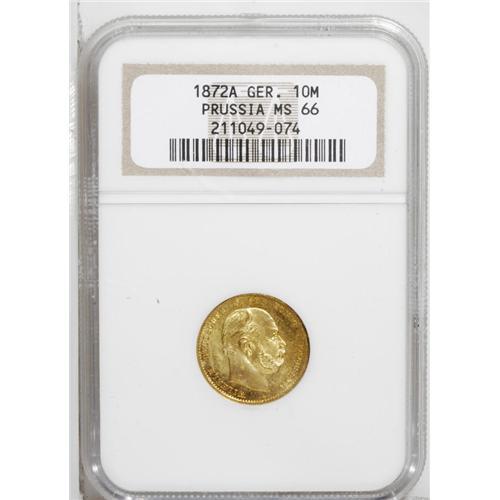 <B>Prussia. Wilhelm I gold 10 Mark 1872-A, </B></I>KM502, MS66 NGC, a choice coin with light original toning.