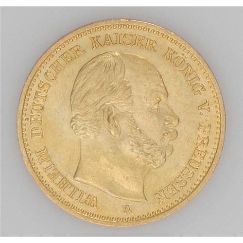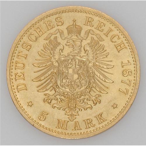 <B>Prussia. Wilhelm I gold 5 Mark 1877-A, </B></I>KM507, lightly cleaned XF, exceptionally sharp details on the reverse.
