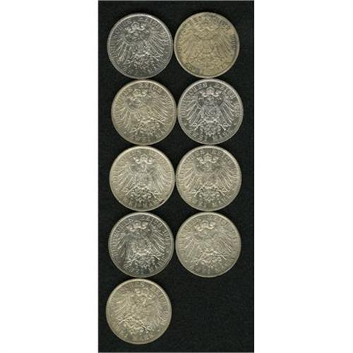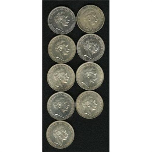 <B>Prussia. Wilhelm II 2 Mark Date Collection, </B></I>KM522, nine coins including: 1902-A, VF-XF,harshly cleaned at one time and now toned, 1903-A, XF-AU, 1904-A, AU, 1905-A, XF+, 1906-A, XF-AU, 1907-A, cleaned AXF, 1908-A, nice lustrous AU, 1911-A, nice XF and 1912-A, cleaned XF. <B>Sold as is, no return lot.</B></I>