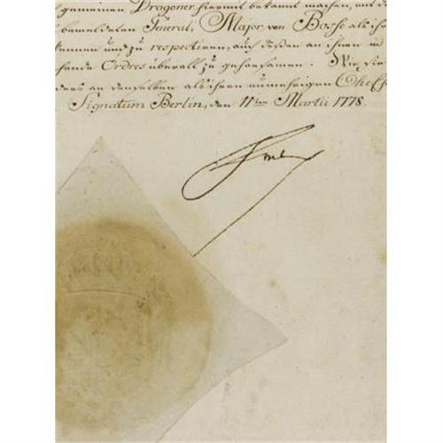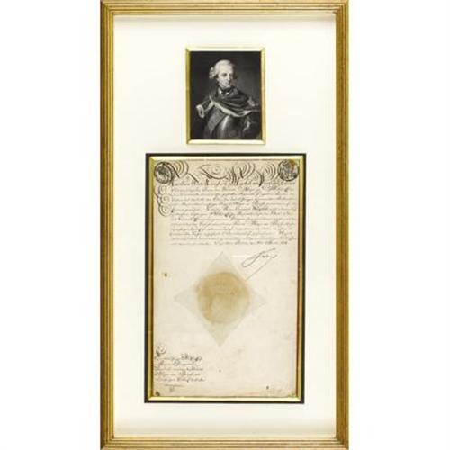 <B>Prussian Frederick the Great Military Document with Seal</B></I> <BR><I>1778</B></I><BR><BR>Intact, signed, framed with contemporary engraving, document-13 x 8 in.; frame-13 x 26 in.<BR><BR>Provenance:<BR>Purchased at Argosy Books, New York<BR><BR><b>Shipping:</b> Requires 3rd Party Shipping (<a target="_blank" href="http://www.heritageauctions.com/common/shipping.php">view shipping information</a>)