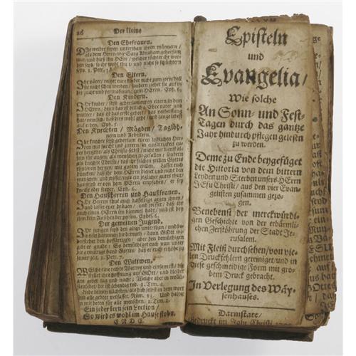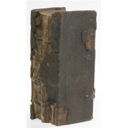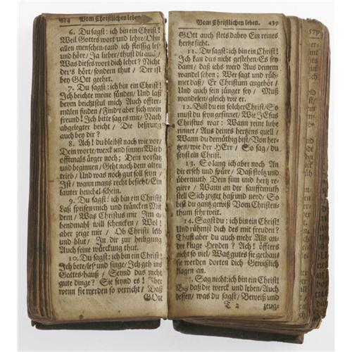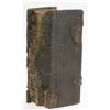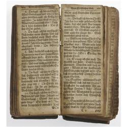 <B> <I> Psalms, Hymns, and Catechism (Luther) Book. </B></I> </B></I> (Darmstadt, Germany: circa 1700), 300 pages, brown calf over wooden boards, skinny 16mo (2.5" x 6.5"), once had metal clasps and straps. It is possible that this book came from one of the early German religious settlements in America; the Ephrata Cloister. German settlers who were seeking spiritual goals and freedoms instead of earthly rewards founded the Ephrata Cloister in 1732. They lived their lives by Acts 2:44 <I> "All believers were together and had everything in common." </B></I> The Ephrata Cloister produced many pamphlets and publications throughout their history, including a large collaboration with the Mennonite Community, in which they published a translated version of the <I> Martyrer -Spiegel </B></I> (The Martyrs' Mirror.) Books like this one with religious lessons and teachings were very important to the Cloister and it's youth who were educated and reared within the walls. <r The book is in good condition; the leather on the spine is nearly gone; clasps and straps are missing; all pages and leaves are present; leather is rubbed and torn; corners bumped; acid degradation has made most of the pages very fragile. From the Henry E. Luhrs Collection.