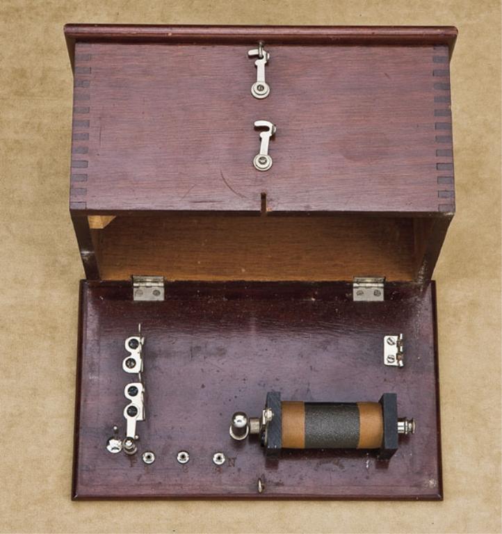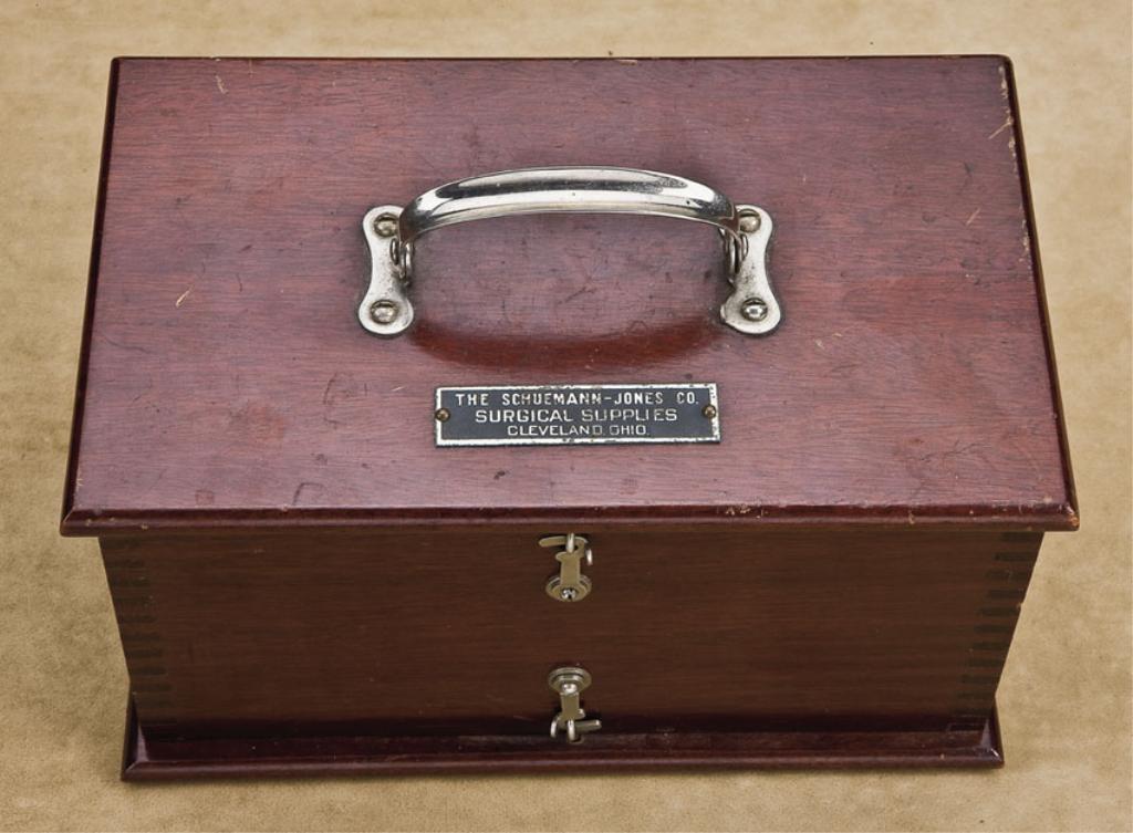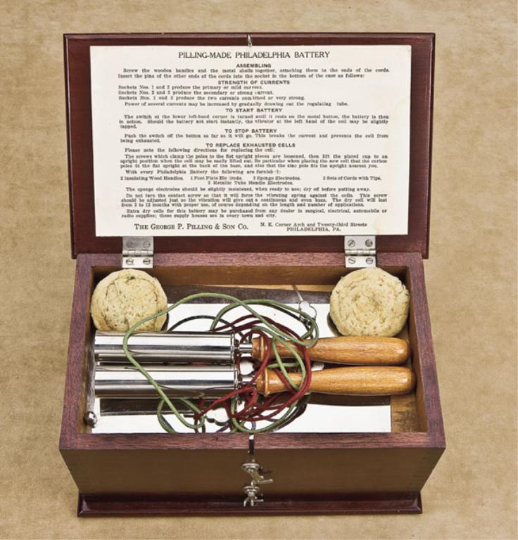 Pseudo-medical (quack device) by Schuemann-Jones Co., Cleveland, Ohio, in original box, with a label “George Pilling & Son Co”, for the administration of electrical shock therapy through the power of a dry-cell device. Circa about 1900-1920. Excellent to near mint condition in box. Many testimonials as to the value of these instruments were made, and this manufacturer went to every effort to make his product look legitimate. A great gift for your favorite medical student or doctor. Est.: $350-$700