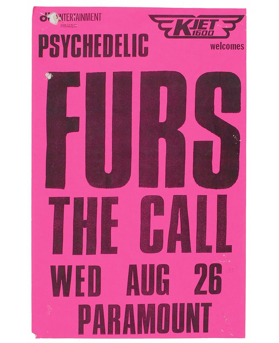 Original bright pink concert poster, 11 x 17, on lightweight paper, for the Psychedelic Furs and The Call at the Paramount, sponsored by KJET 1600. In very good condition, with scattered staple holes, several small tears and areas of paper loss, and a couple of small ink notations.