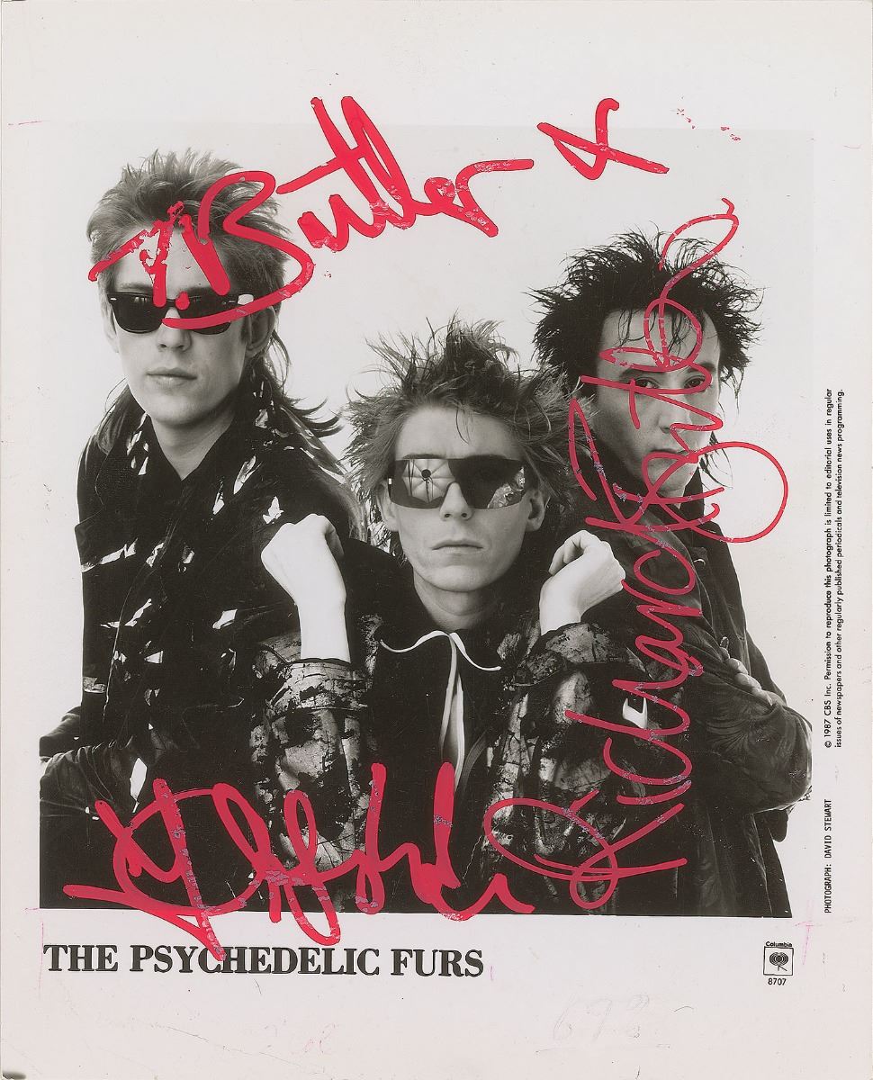 Circa 1987 glossy 8 x 10 Columbia publicity photo of The Psychedelic Furs, signed in red paint pen by Richard Butler, Tim Butler, and Rich Good. In very good to fine condition, with scattered light creasing and surface impressions, and some scuffing to the red paint pen. Consignor notes that the signatures were obtained in person before a show in Cleveland, Ohio.