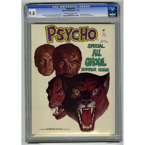 <B>Psycho #15 (Skywald, 1973) CGC NM/MT 9.8 Off-white to white pages.</B></I> Special All-Ghoul issue. Jose Gual biography and photo. Segrelles painted cover. Jesus Duran and Maelo Cintron art. Highest CGC grade for this issue. Overstreet 2006 NM- 9.2 value = $40. CGC census 2/07: 1 in 9.8, none higher.<BR><BR><b>Shipping:</b> Comics - Slabbed (certified) (<a target="_blank" href="http://www.heritageauctions.com/common/shipping.php">view shipping information</a>)
