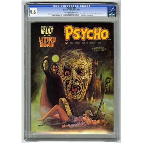 <B>Psycho #17 (Skywald, 1974) CGC NM+ 9.6 Off-white to white pages.</B></I> Special Showcase issue. Horror Preview contest. "Death Rock" frontispiece. Faba cover. Ricardo Villamonte art. Highest CGC grade for this issue. Overstreet 2006 NM- 9.2 value = $40. CGC census 2/07: 1 in 9.6, none higher.<BR><BR><b>Shipping:</b> Comics - Slabbed (certified) (<a target="_blank" href="http://www.heritageauctions.com/common/shipping.php">view shipping information</a>)