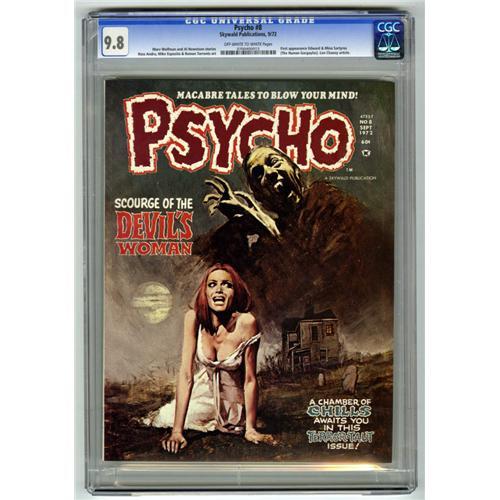 <B>Psycho #8 (Skywald, 1972) CGC NM/MT 9.8 Off-white to white pages.</B></I> First appearance of Edward and Mina Sartyros (The Human Gargoyles). Painted cover. Ross Andru, Mike Esposito, and Ramon Torrents art. Overstreet 2006 NM- 9.2 value = $65. CGC census 2/07: 1 in 9.8, none higher.<BR><BR><b>Shipping:</b> Comics - Slabbed (certified) (<a target="_blank" href="http://www.heritageauctions.com/common/shipping.php">view shipping information</a>)