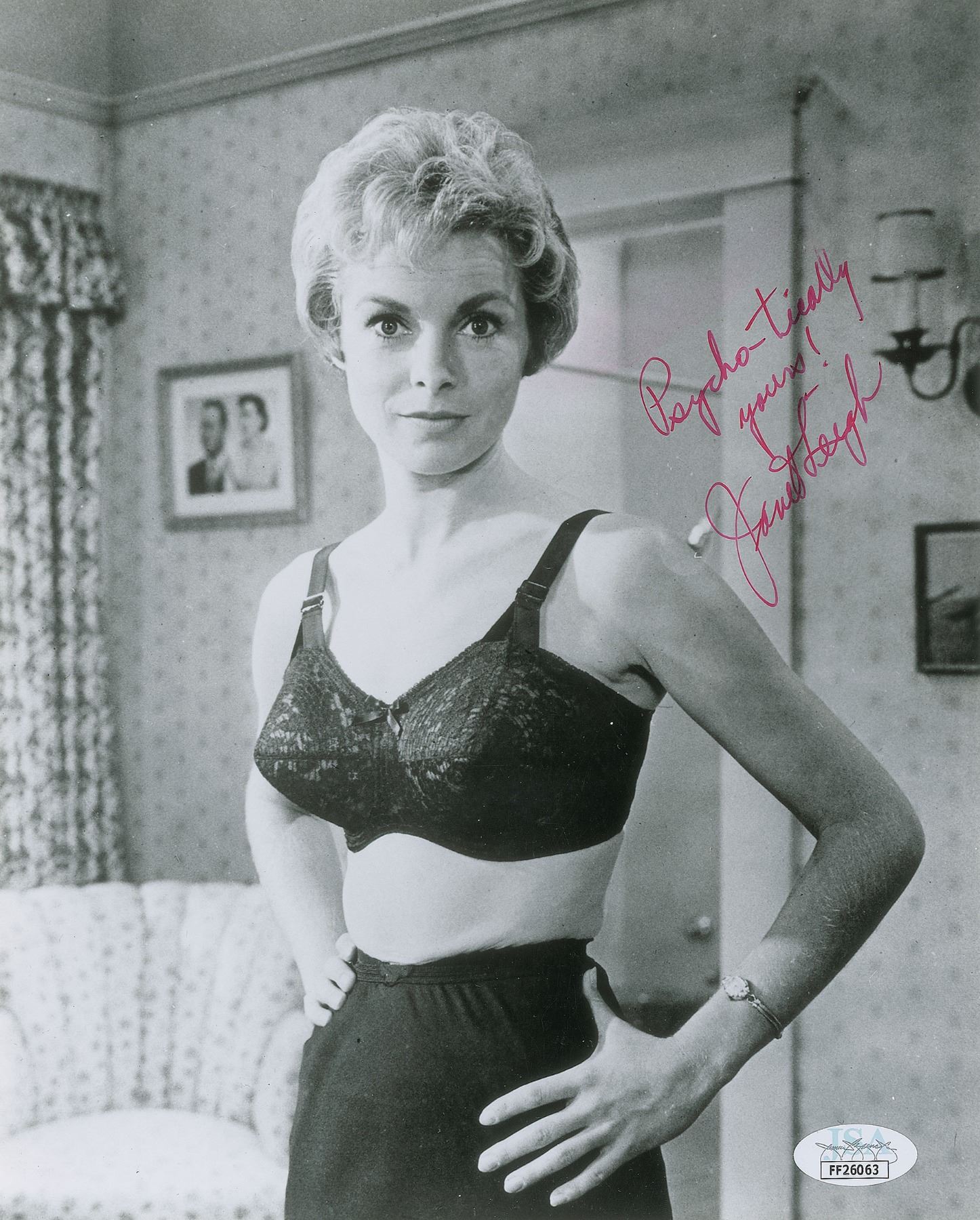Fantastic glossy 8 x 10 photo of Janet Leigh as the half-dressed Marion Crane in the classic 1960 horror film Psycho, desirably signed in red felt tip, "Psycho-tically yours! Janet Leigh." In very fine condition, with a JSA label affixed to lower right corner. Accompanied by a certificate of authenticity from JSA.