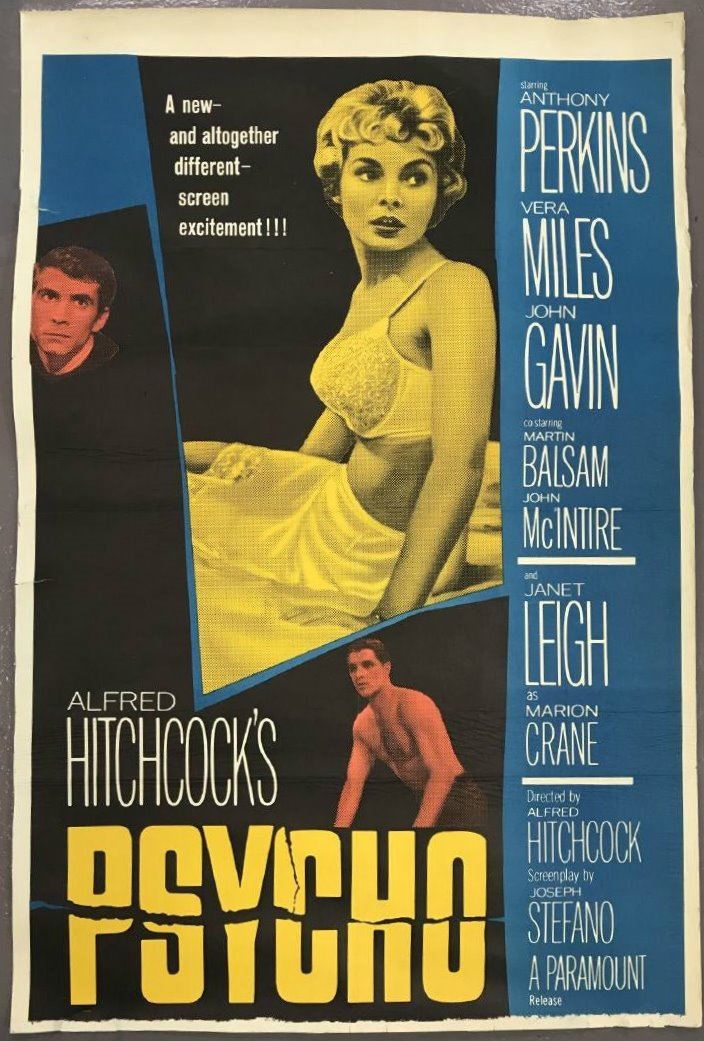 Psycho (Paramount, 1960). One Sheet (27"X41")  Hitchcock. Starring Anthony Perkins, Janet Leigh,  Vera Miles, John Gavin, Martin Balsam, John  McIntire, Simon Oakland, Vaughn Taylor, Frank  Albertson, Lurene Tuttle, Patricia Hitchcock, John Anderson, Mort Mills, Alfred Hitchcock, Frank  Killmond, and Ted Knight. Directed by Alfred  Hitchcock.