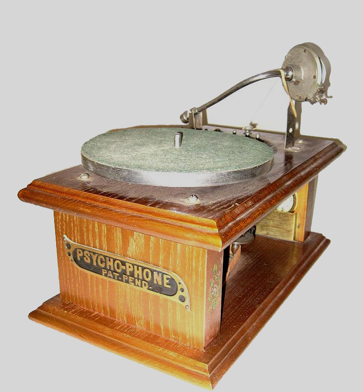 Psycho-Phone Phonograph - an acoustic machine driven by an electric motor. Attractive walnut-colored wood with decals on either side of front and back. Metal plate reading "Psycho-Phone" on side. Original cloth-covered electrical cord present, but detached and fraying in some spots. Overalll dimensions approx. 15" W x 9" D x 6,5" H.