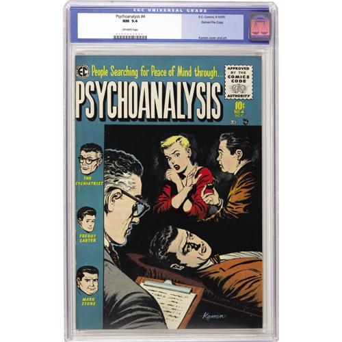 <B>Psychoanalysis #4 Gaines File pedigree 9/12 (EC, 1955) CGC NM 9.4 Off-white pages.</B></I> Jack Kamen retired from comics about this time, but this cover has the look of an artist at the top of his game. His dramatic stylings fit this title's theme perfectly. CGC lists just one nicer copy of issue #4 in its current census of certified comic books. Overstreet 2006 NM- 9.2 value = $200. CGC census 10/06: 2 in 9.4, 1 higher.<BR><BR><b>Shipping:</b> Slabbed Comic (<a target="_blank" href="http://www.heritageauctions.com/common/shipping.php">view shipping information</a>)