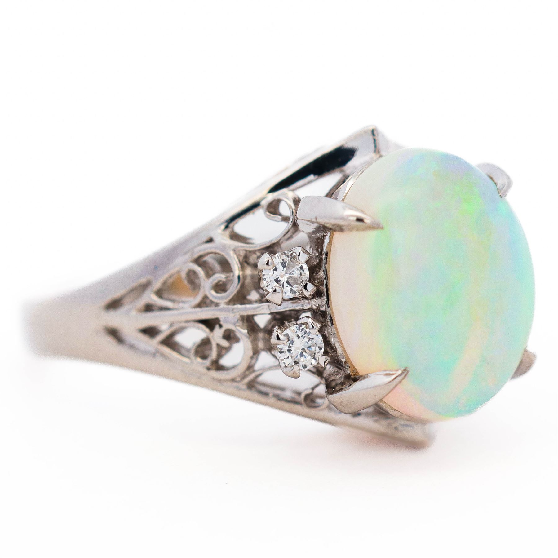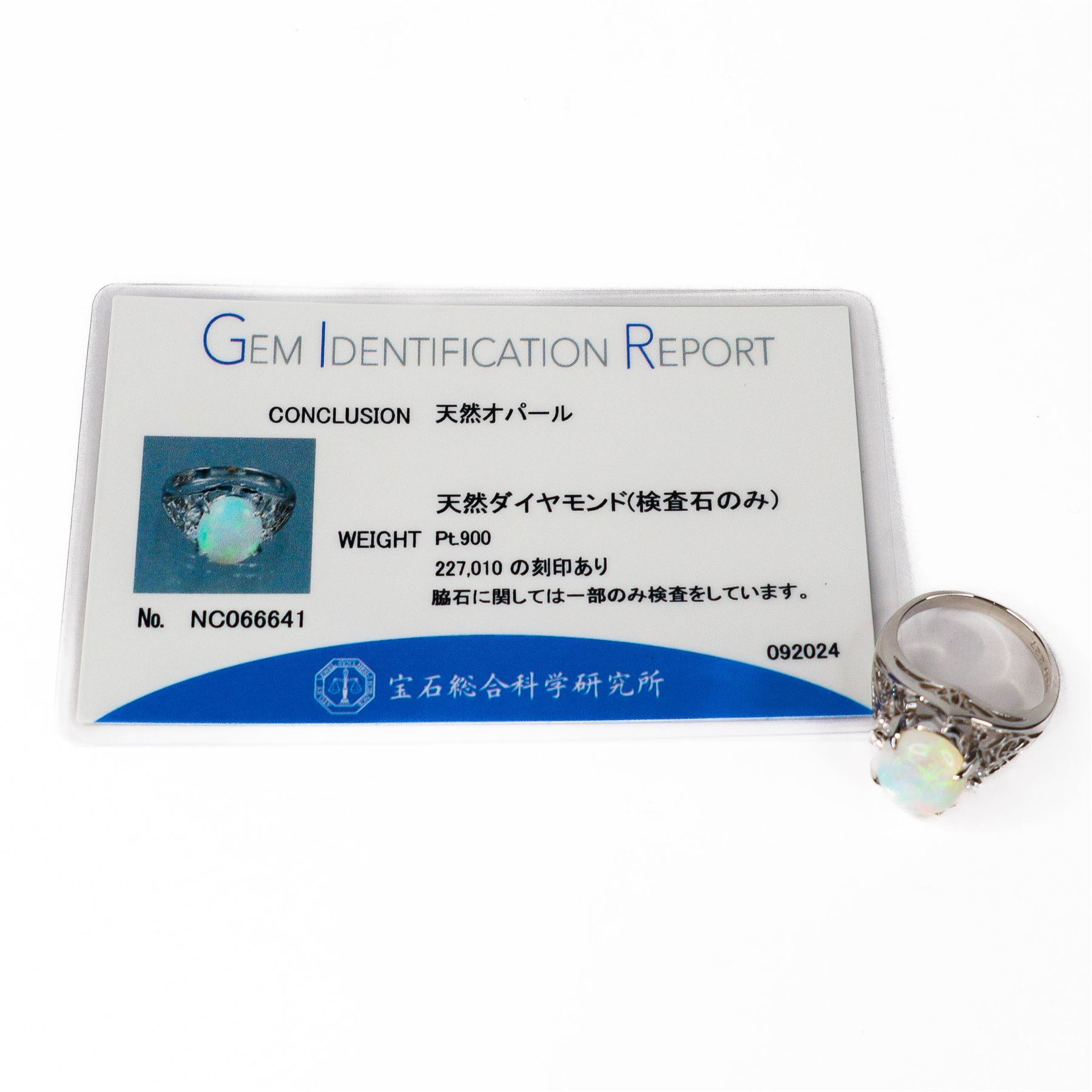 Delicately pierced cathedral shoulders evoke a late-Art Deco aesthetic, framing the oval opal with fine single-cut diamonds. The opal’s soft, translucent body color flashes greens, oranges and violets under direct light, creating an understated yet vibrant focal point. A well-finished platinum gallery and tight prongs provide secure, everyday wear, while the included Japanese gem certificate supports authenticity for resale or insurance.