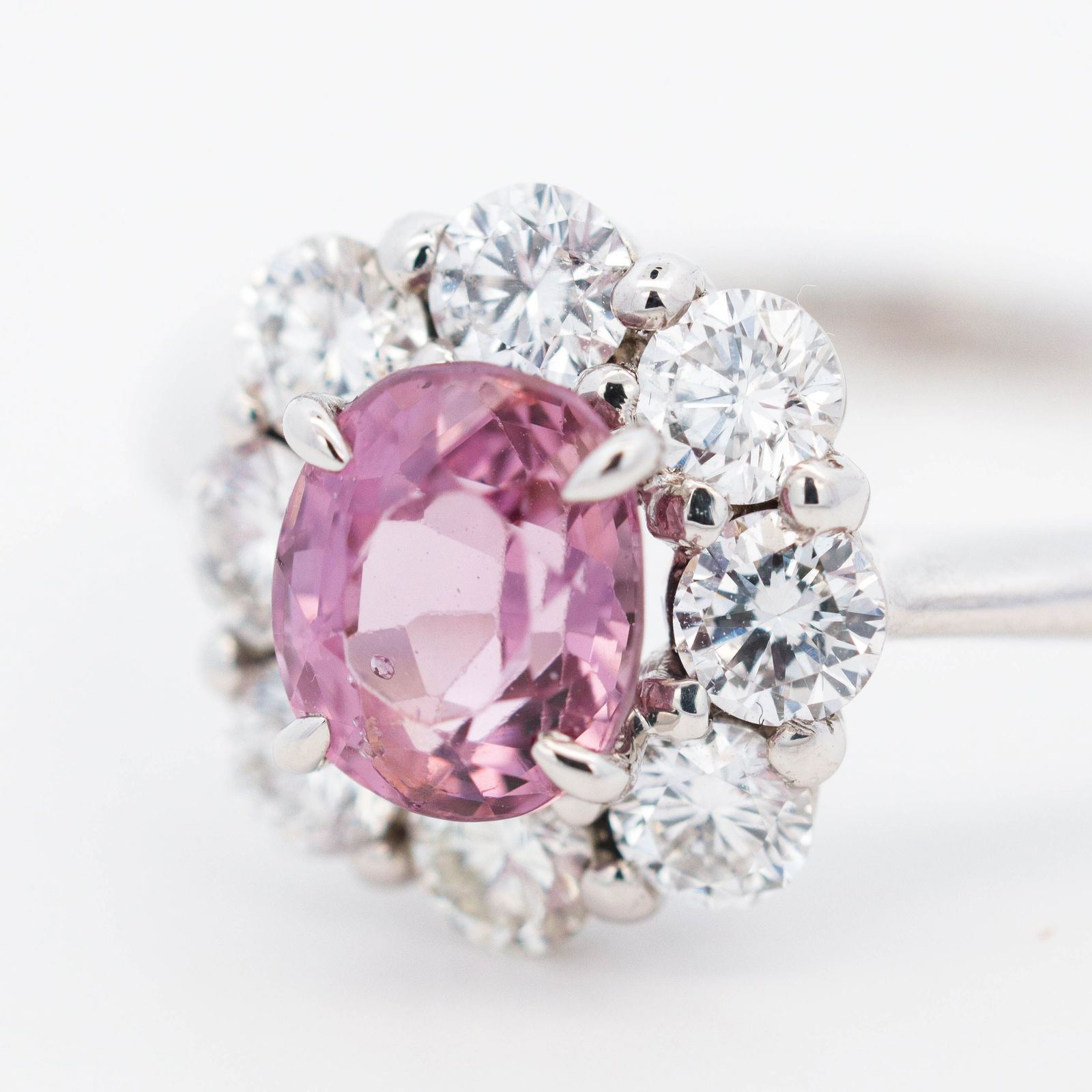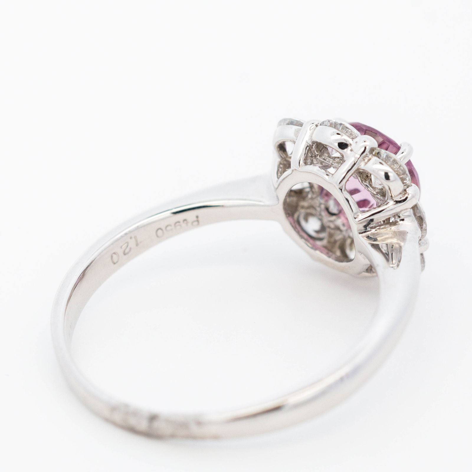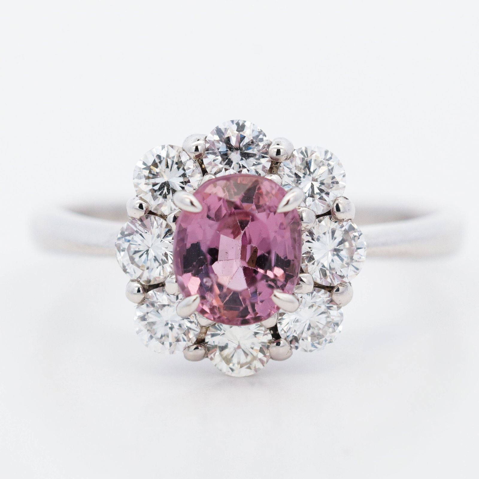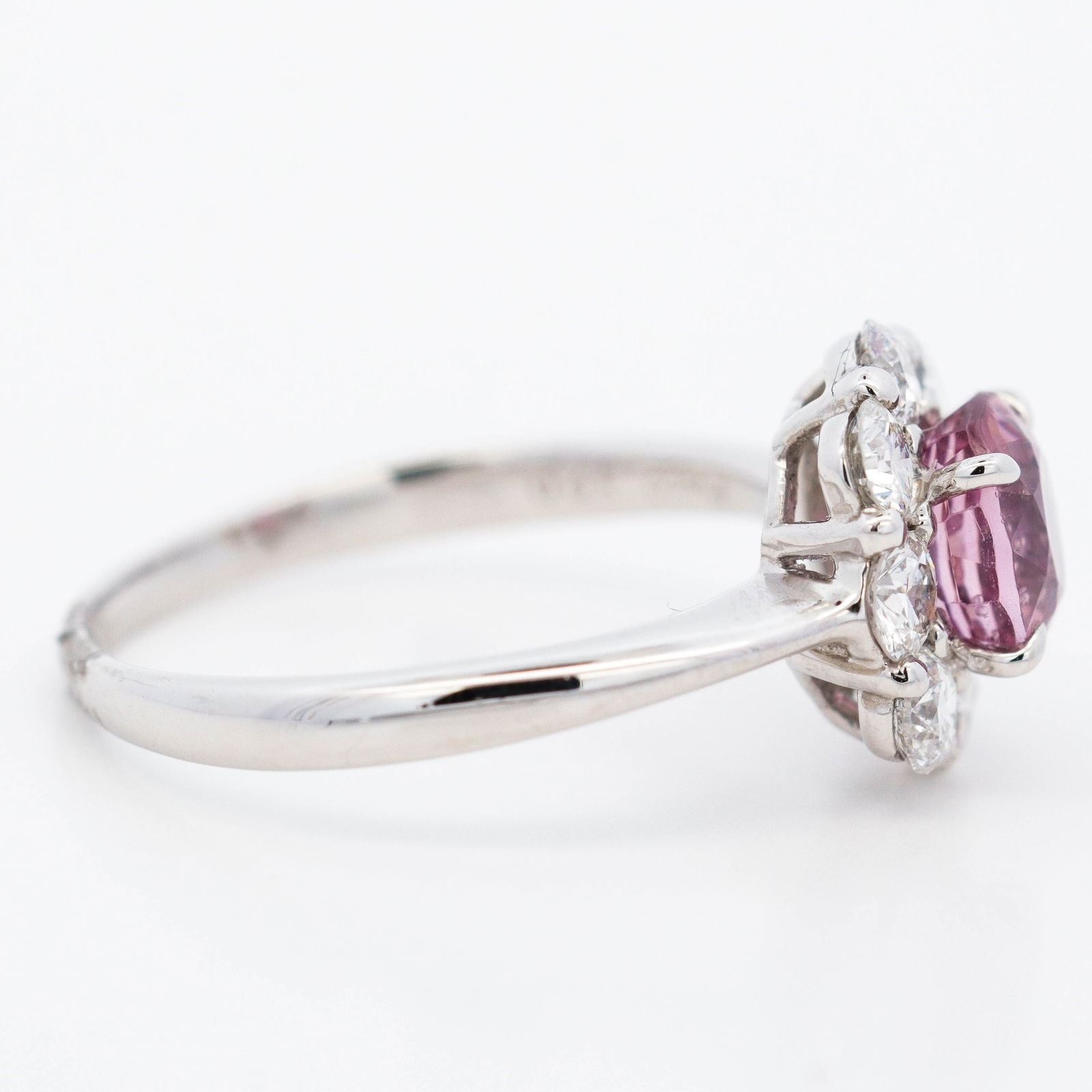 Metal: Pt950, bright polish Spinel: 1.20 ct oval mixed cut, transparent violet-pink, Burma origin, no heat, MTGL 10108714 Diamonds: ?0.82 ctw round brilliants, F-G, VS Setting & Design: four-prong mount, scalloped diamond cluster halo, pierced basket, cathedral shank Size: 6 ¾ (resizable) Condition: excellent; secure prongs, no evident repairs