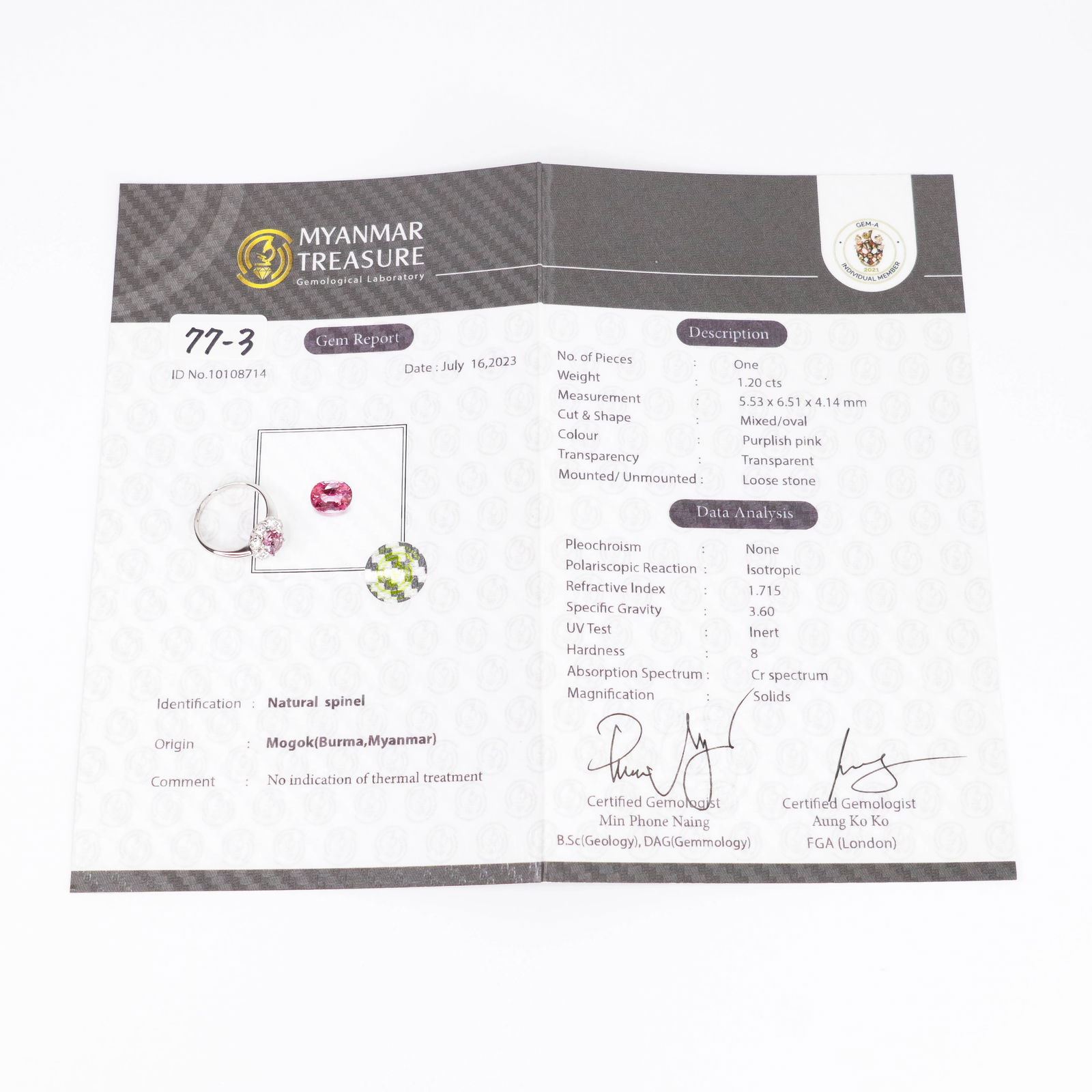 Crafted in high-fineness platinum, the ring centers a 1.20 ct oval mixed-cut spinel of delicate violet-pink hue, certified by MTGL (No. 10108714) as natural Burmese origin with no indications of heat. The gem is secured by four claw prongs and framed by a scalloped halo of near-colourless round brilliant diamonds that provide a calculated 0.82 ctw, graded about F-G colour and VS clarity. A low pierced basket gallery maximises light return while keeping the profile refined, and a high-polish cathedral shank gives sturdy support. Workmanship is crisp; all stones are tight and the piece shows minimal wear.